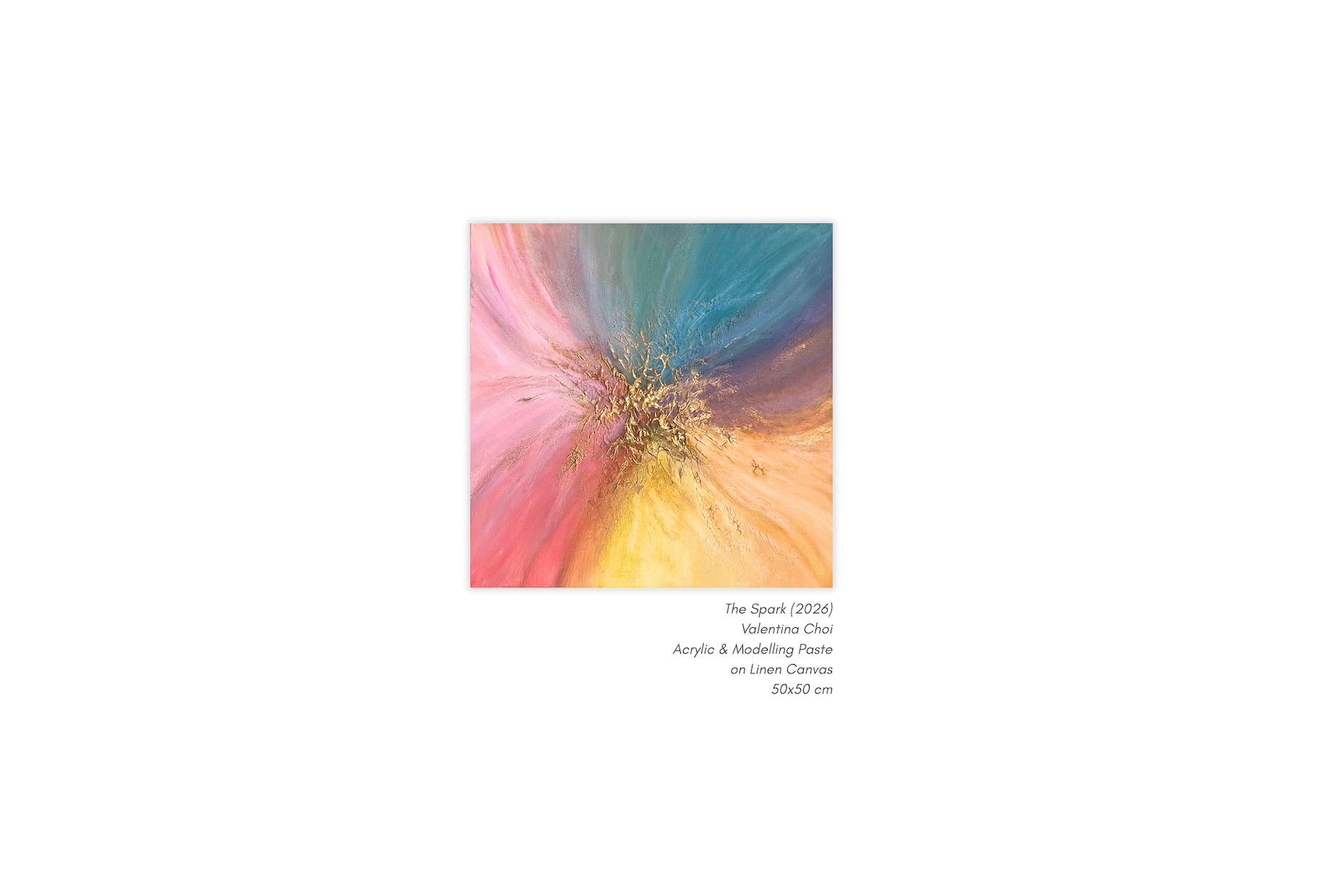 The piece is intentionally open to interpretation, allowing its colours and energy to resonate differently with each viewer based on their own personal life experiences. What emotions do the different hues evoke for you? Do they echo a spark you are feeling, or one you once experienced, toward someone or something?