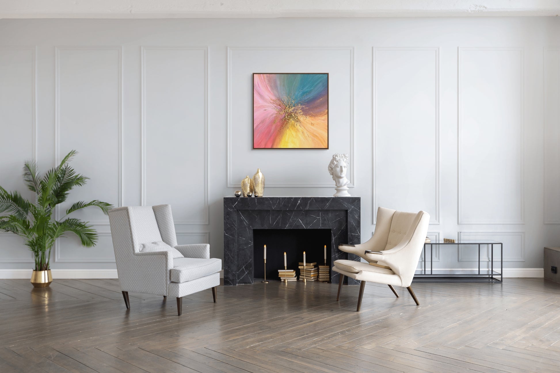 A sophisticated contemporary piece, it thrives in both light-filled spaces and darker, neutral interiors. Its layered, colourful composition allows it to stand out as a statement focal point, while remaining harmonious within more subdued settings. At an easily workable 50 × 50 cm, the piece offers versatility in placement, bringing energy, depth, and visual interest without overwhelming the space.